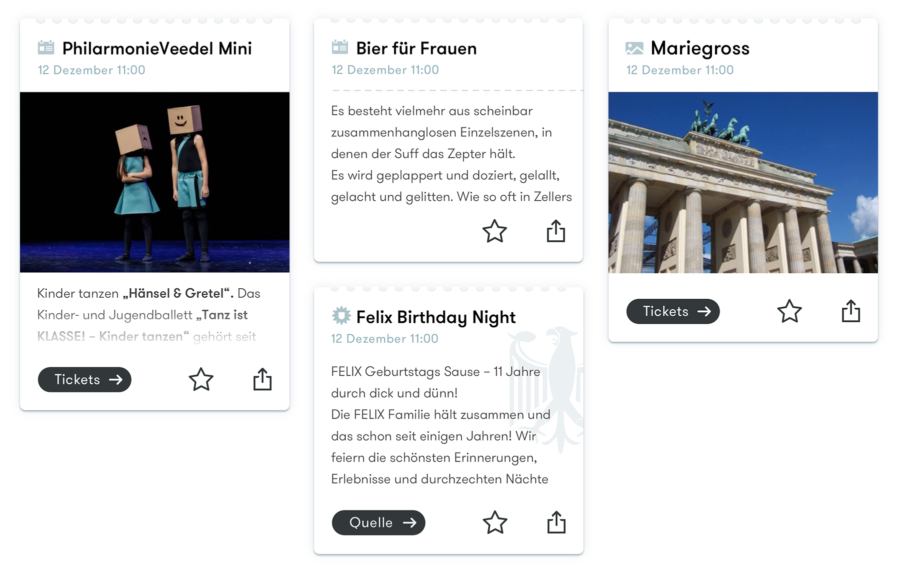 Внутри приложения четыре типа карточек: "событие", "новость", "сообщение полиции" и "достопримечательности". Скоро появится Twitter и другие социальные сети, а также спорт, радио, городские службы и транспорт.