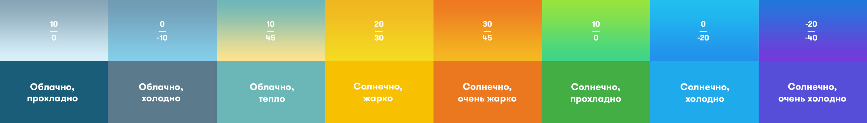 Каждому состоянию ставим в соответствие, помимо привычной пиктограммы, цвет и градиент. Таким образом, постоянным пользователям будет понятен прогноз погоды и без деталей.
